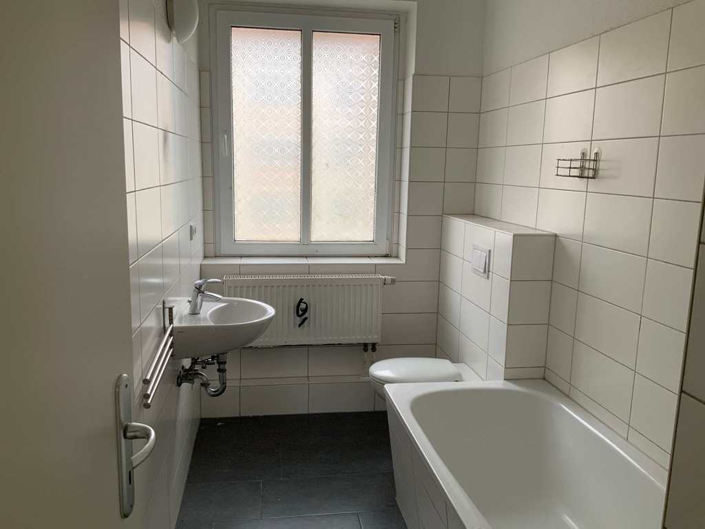 Die Wohnung frisch weiß gestrichen. Der Fußboden hat einen PVC in Laminatoptik. Das Bad ist gefliest und mit einer Wanne ausgestattet.