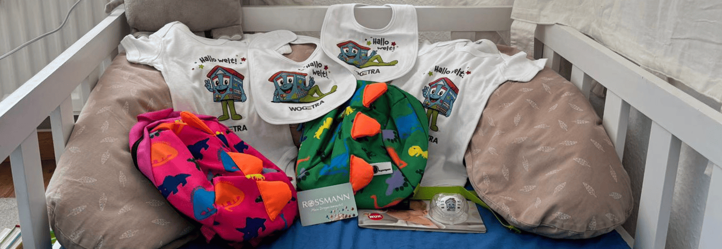 Auch wir freuen uns von Herzen mit Ihnen und möchten Ihr neu geborenes Familienmitglied in unserer Genossenschaft begrüßen. Seit dem 1. Januar 2019 überreichen wir Ihnen eine liebevolle „WOGETRA-Nesthäkchen-Überraschung“. In dem Päckchen finden Sie einen Schnuller mit Willy-Aufdruck, einen 50,00 € Gutschein für dm oder Rossmann sowie ein Body und Lätzchen mit Aufdruck von unserem Maskottchen Willy.