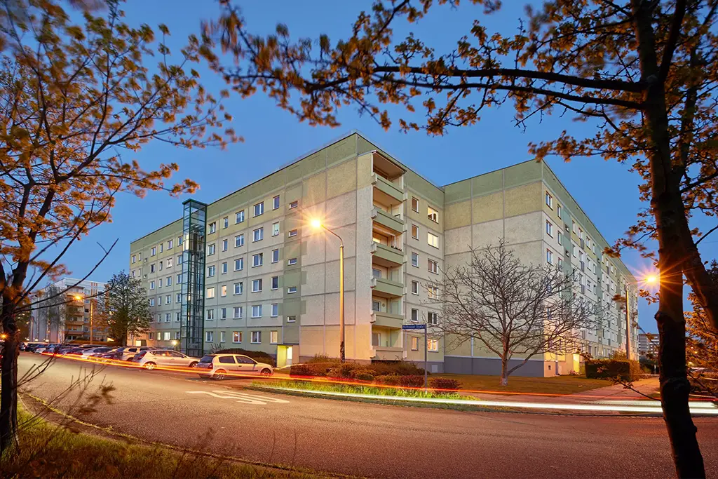 Die 6– und 11–geschossigen Häuser in Grünau-Mitte verfügen über kleine 1–Raum–Wohnungen bis hin zu geräumigen 5–Raum–Wohnungen. Bis auf wenige Ausnahmen sind unsere Wohnhäuser alle mit einem Aufzug sowie Balkonen ausgestattet. Alle Küchen sind mit Fenstern versehen. Unsere grünen Innenhöfe mit Pergolen, Bänken und Spielplätzen bieten Senioren und Familien gleichermaßen Erholung.